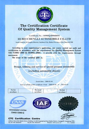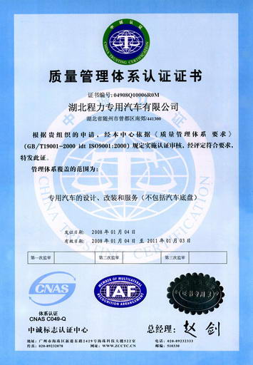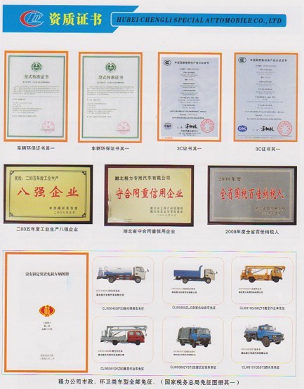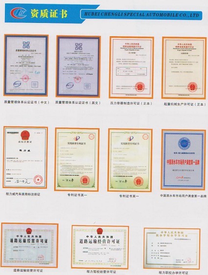 程力专用汽车股份有限公司是中国知名国林绿化、石油化工、市政环卫、压力容器专用汽车制造商!湖北程力公司技术雄厚,检测手段完备,拥有国内外先进的生产设备,产品质量稳定,经营方式灵活,程力公司已率先全面通过ISO9001-2000国际质量体系认证,产品全部通过3 C国际强制产品认证,并通过出口产品的各项认证。程力公司服务宗旨是:以质量求生存、信誉是保证。诚信待人、灵活经营、高质低价、讲究效率。以下是程力专用汽车股份有限公司资质证书!
